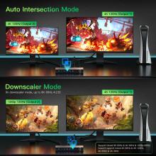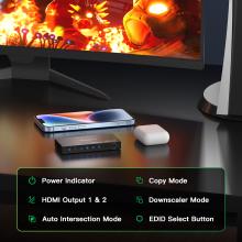 • 【Integrated 3 EDID functions】Scaler Mode: This feature allows the splitter to support mixed resolution when two displays with same refresh rates but different resolutions, one of the output signal will be downscaling from 8K to 4K or 1080p. Copy Mode: Copy EDID from OUTPUT 1. Auto Mode: Automatically identify and output the lower resolution and audio format of both outputs