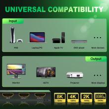 • 【 8K 60Hz/ 4K 120Hz Resolution 】This splitter specifically designed to handle 8K@60hz, 4K@120Hz, 1080p@240Hz, also supports HDMI 2.1, HDCP 2.3/2.2/1.4, HDR10, HDR10+, Dolby vision, 3D, CEC, high speed 40Gbps video bandwidth.