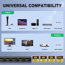 - 【Broad Compatibility】This HDMI 2.1 switcher is compatible with PC, PS4 Pro, PS5, Xbox Series X, Blu-Ray Player, Chromecast, MacBook, UHD TV, Projector, Monitor, etc.