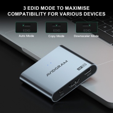 - 【Integrated 3 EDID functions】Auto Mode: Automatically identify and output the lower resolution and audio format of both outputs. Copy Mode: Copy EDID from OUTPUT 1. Scaler Mode: This feature allows the splitter to support mixed resolution when two displays with the same refresh rates but different resolutions, one of the output signals will be downscaling from 4K 60Hz to 1080P 60Hz or 4K 30Hz to 1080P 30Hz.