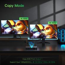• 【Integrated 3 EDID functions】Scaler Mode: This feature allows the splitter to support mixed resolution when two displays with same refresh rates but different resolutions, one of the output signal will be downscaling from 8K to 4K or 1080p. Copy Mode: Copy EDID from OUTPUT 1. Auto Mode: Automatically identify and output the lower resolution and audio format of both outputs